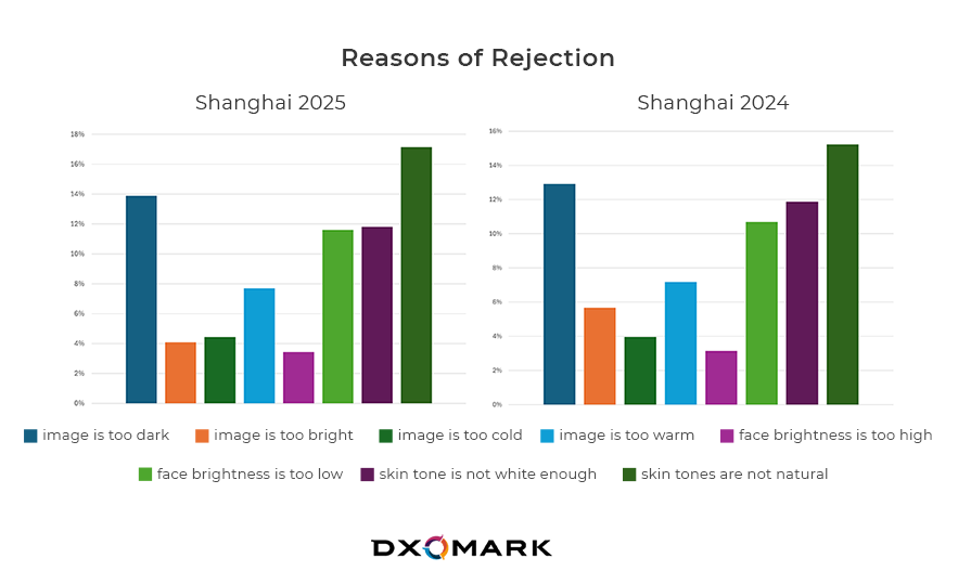 Comparing Shanghai surveys from 2024 and 2025 revealed nearly identical rejection reasons: images that were too dark, unnatural skin tones, insufficient facial brightness, or lack of skin fairness.